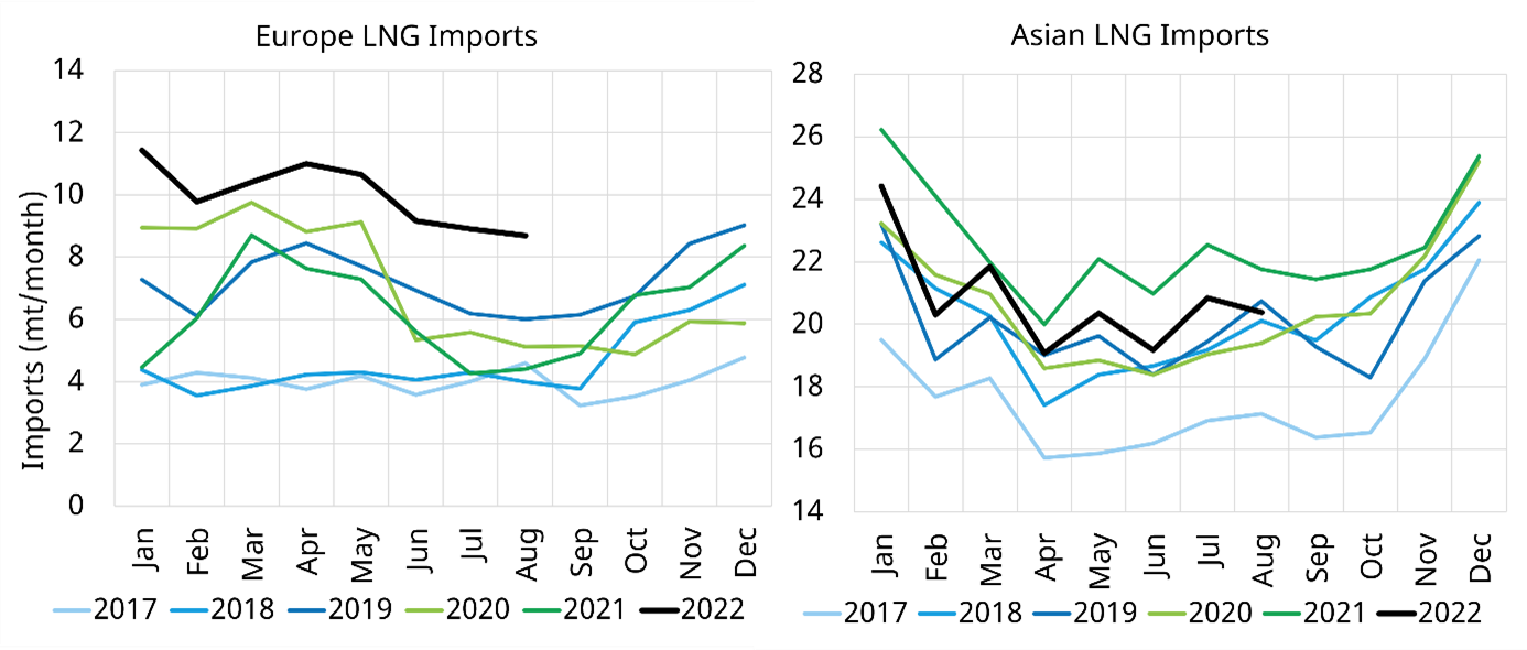 Wyższy import LNG w 2022 r. był możliwy dzięki znacznemu ograniczeniu popytu na innych rynkach regionalnych. Odbyło się to kosztem ekstremalnego wzrostu cen. Import azjatycki spadł w sierpniu o 1,9 mln t w porównaniu z rokiem ubiegłym, podczas gdy import z Ameryki Południowej spadł o 1,6 mln t.