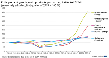 W wyniku rosnących cen energii produkty energetyczne są główną kategorią importu z Rosji, Stanów Zjednoczonych i Wielkiej Brytanii. Import mocno spadł podczas pandemii, ale zaczął odrabiać straty w III kwartale 2020 roku.