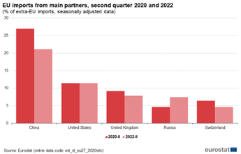 Porównując II kwartał 2020 r. z najnowszymi danymi za II kwartał 2022 r. udział importu z Rosji wzrósł o 2,8%, natomiast udział importu ze Stanów Zjednoczonych nie zmienił się. W tym samym okresie import z Wielkiej Brytanii, Szwajcarii i Chin spadł odpowiednio o 1,3%, 1,8%.