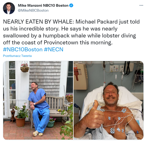 Michael Packard, poławiacz homarów powiedział, że nurkował, kiedy na około 30-40 sekund wylądował w paszczy wieloryba. Humbak po chwili wypluł go, a Packard ma jedynie podejrzenie zwichniętego kolana.