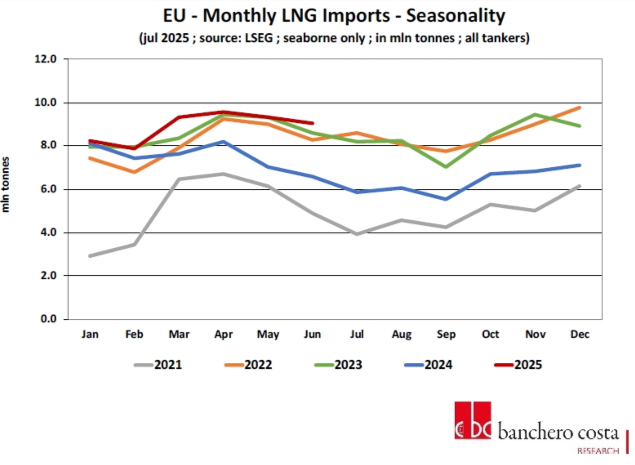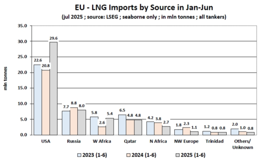 Unia Europejska ładuje magazyny gazu i próbuje odejść od węgla kupując gaz amerykański i uzupełniając jego popyt importem z Morza Północnego. Kraje UE są największym importerem LNG na świecie, odpowiadając za 25,2% globalnego popytu na LNG. W I połowie 2025 r. UE importowała 53,3 mln ton, co stanowi wzrost o 18,5% r/r w porównaniu z 45 mln ton w I połowie 2024 r. Jest to również więcej od rekordu z I połowy 2023 r., kiedy w terminalach LNG rozładowano 51,6 mln ton.