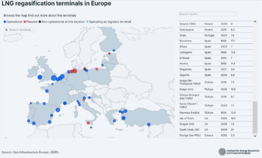 Największymi portami przez które dostarczano płynny gaz do Unii Europejskiej w 2024 r. były Rotterdam (10,3 mln ton w 2024 r.), Dunkierka (7,7 mln ton) oraz Zeebrugge (7,4 mln ton). Kolejne miejsca zajął terminal rozładunkowy LNG Porto Levante (6,2 mln ton), Fos (5,9 mln ton) oraz Świnoujście (4,8 mln ton). Gazoport w Świnoujściu w 2024 roku obsłużył 300. dostawę zbiornikowcami LNG. W 2024 roku terminal LNG w Świnoujściu odebrał 49 dostaw skroplonego gazu ziemnego. W 2025 roku Gaz-System zakończył rozbudowę terminalu, co pozwoliło zwiększyć przepustowość instalacji do regazyfikacji do 8,3 mld m³ gazu rocznie.