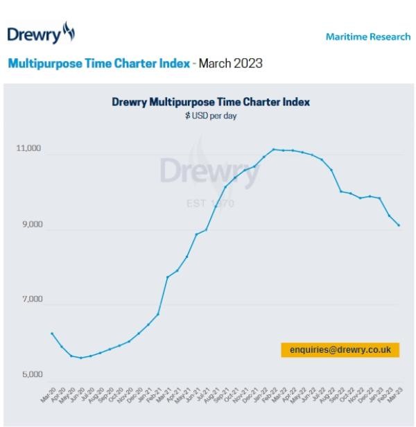 Na rynku drobnicowców wielozadaniowych odnotowywano silne spadki w zakresie zarówno frachtów jak i stawek czarterowych. Do tej pory negatywne trendy były bardziej stonowane. Jednakże globalna gospodarka w zakresie inwestycji zwalnia. Ma to konsekwencje w podaży ładunków inwestycyjnych i ponadgabarytowych oraz ciężkich przewożonych między innymi drobnicowcami wielozadaniowymi czy też ciężarowcami. Jak wskazują dane firmy analitycznej Drewry, rynek czarterów badanego koszyka drobnicowców wielozadaniowych pozostaje nadal pod silną presją. Jak dotychczas w marcu odnotowano spadek na poziomie 2,7%, osiągając tym samym poziom indeksu na poziomie USD 9,175. Oznacza to spadek o 17,8% w stosunku do marca 2022 roku.