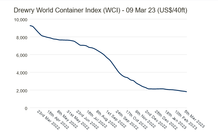 Co jednak ważne, patrząc na wykres indeksu, że negatywna tendencja wyhamowuje. Nie są widoczne aż tak drastyczne spadki jak to miało miejsce w dużej części 2022 roku. Średni poziom indeksu znajdował się w ostatnich miesiącach na poziomie około 1,800 USD za kontener 40-to stopowy przewożony na kluczowych trasach transportu kontenerowego.