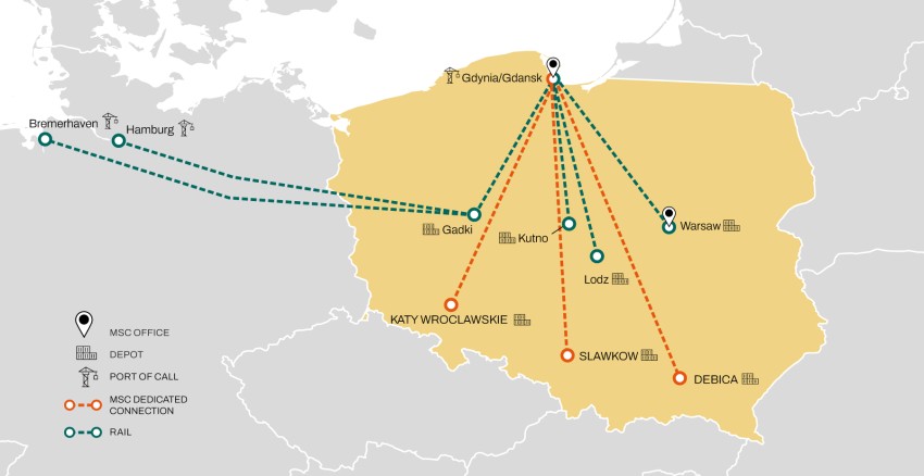 Jako światowy lider w transporcie kontenerowym, MSC od lat rozwija swoje usługi intermodalne. Dzięki ramieniu logistycznemu MEDLOG koncentruje się na kluczowych trasach krajowych, łącząc główne terminale morskie w Gdyni i Gdańsku z czterema głównymi regionami w Polsce.