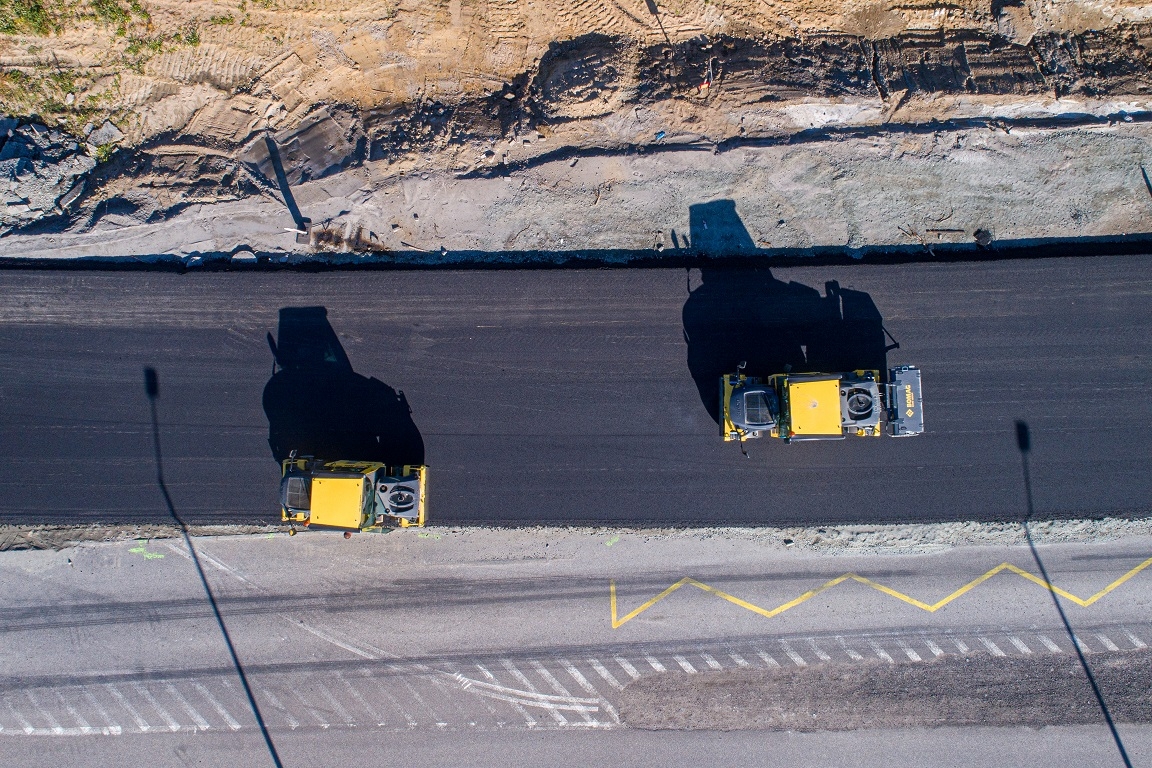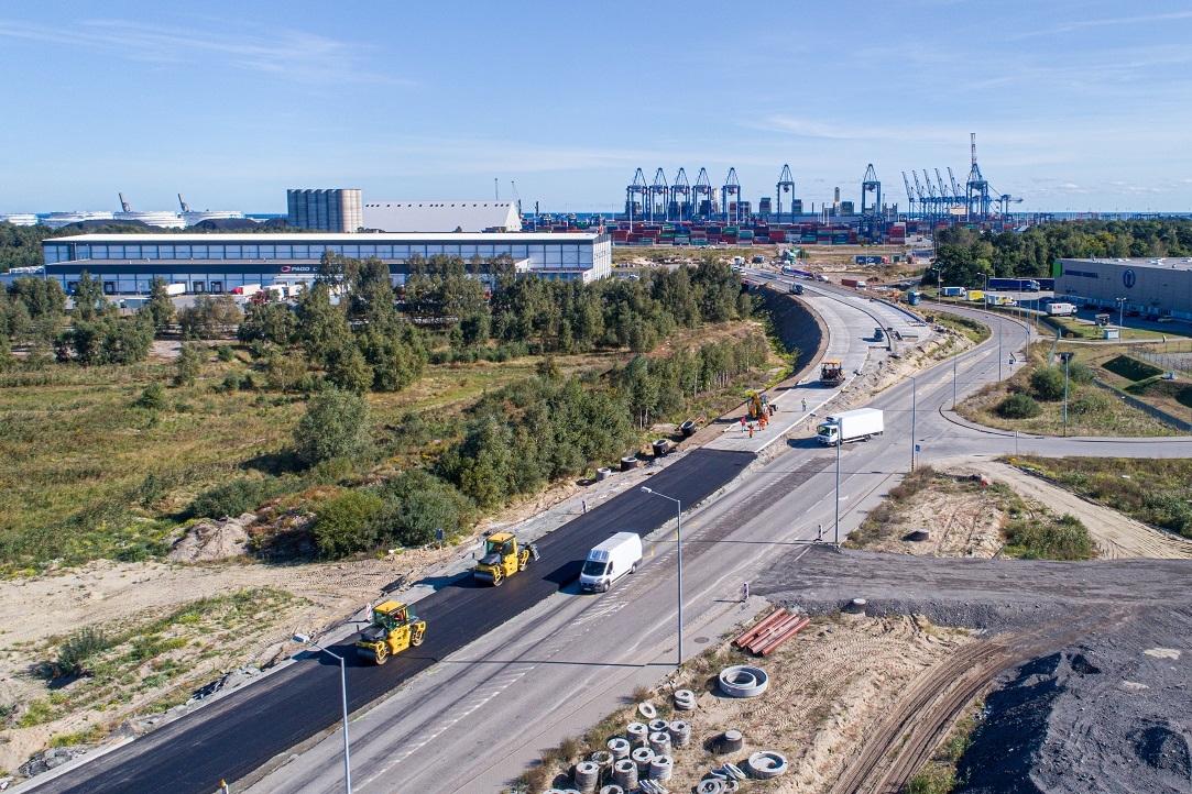 Układane są ostatnie asfalty na końcowym odcinku inwestycji, na ul. Kontenerowej. Prowadzone są tam też prace związane montażem barier ochronnych czy montażem oświetlenia. Oprócz tego toczą się prace wykończeniowe, związane z ułożeniem obruków i humusowaniem skarp, czyli pokryciem ich ziemią urodzajną, na której zostaną nasadzone rośliny.