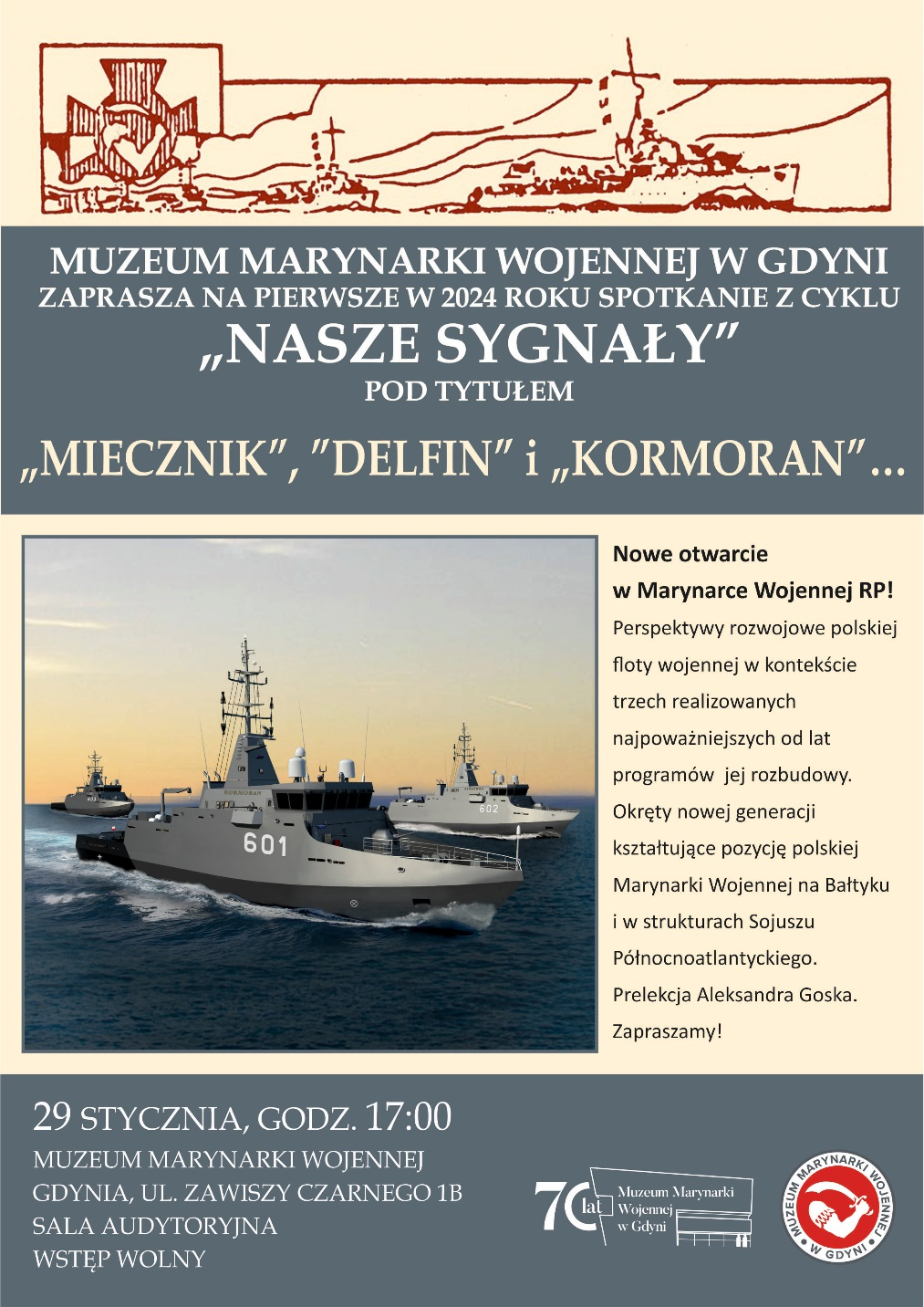 Muzeum Marynarki Wojennej w Gdyni zaprasza na pierwsze w 2024 roku spotkanie z cyklu "Nasze Sygnały" pt. „Miecznik”, „Delfin" i „Kormoran”… - nowe otwarcie w Marynarce Wojennej RP."