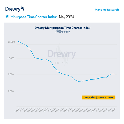 Wskaźnik rynkowy Drewry Multipurpose Time Charter Index oscylował w kwietniu powyżej wcześniej prognozowanych wartości, osiągając poziom USD 9 048. Jak podają analitycy rynku wzrosty napędzane są przez wykonywaną przez statki dodatkową pracę w zakresie ilości wykonanych tonomil w związku z sytuacją na międzynarodowych szlakach żeglugowych.