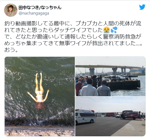 „Gdy nagrywałam filmik o łowieniu ryb, miałam wrażenie, że przypłynęły dryfujące zwłoki, ale okazało się, że to gumowa lalka. Wydaje się, że ktoś inny się pomylił i zadzwonił po władze, więc przyjechało mnóstwo policji, wozy strażackie i karetki pogotowia. Szczęśliwie lalka została bezpiecznie uratowana. Fajnie” – napisała Natsuki.