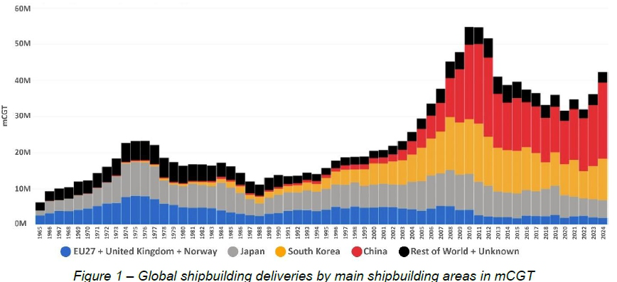 Produkcja statków w CGT od 1965 do 2024 r., źródło: SEA Europe