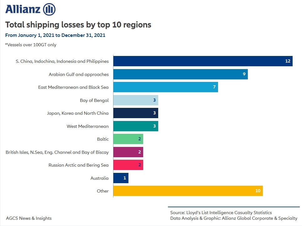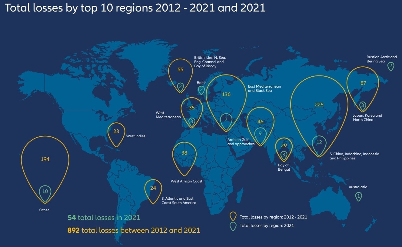 Według raportu w ciągu ostatniej dekady doszło do prawie 900 całkowitych strat (892). Południowe Chiny, Indochiny, Indonezja i region morski Filipin to główne regiony zagrożeń. Tu zanotowano jedną piątą strat w 2021 r. (12) i jedną czwartą strat w ciągu ostatniej dekady (225). Rozwój handlu morskiego, zatłoczone porty, starsze statki i ekstremalne warunki pogodowe to główne czynniki decydujące o stratach, wypadkach i incydentach.