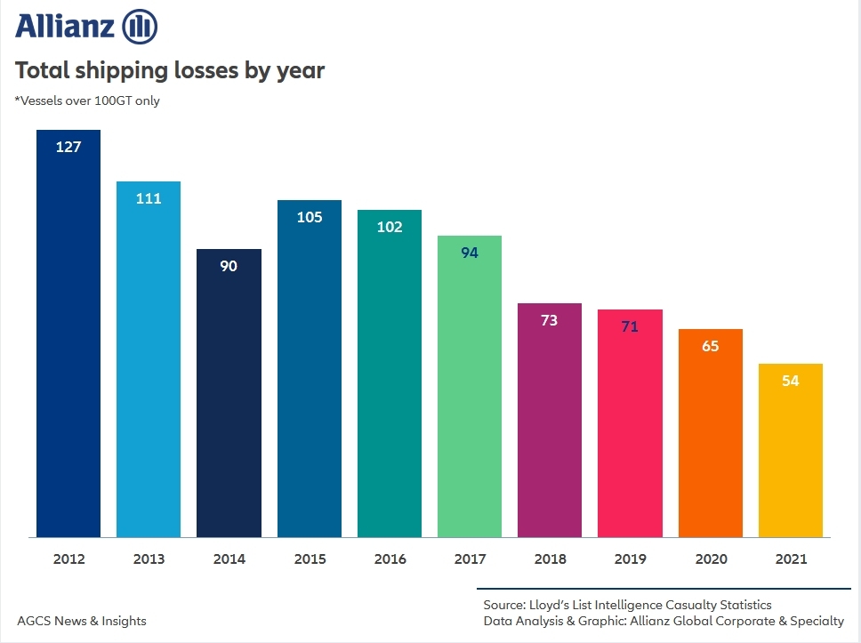 Z danych zebranych przez AGCS, w których poddano straty i wypadki w transporcie morskim dotyczące, jednostek handlowych powyżej 100 ton brutto wynika, że w 2021 r. na całym świecie zgłoszono 54 całkowite straty statków, w porównaniu do 65 straconych statków rok wcześniej. W ciągu 10 lat zanotowano aż 57% spadek, bowiem w 2012 r. utracono 127 jednostek, a na początku lat 90. światowa flota traciła ponad 200 statków rocznie.