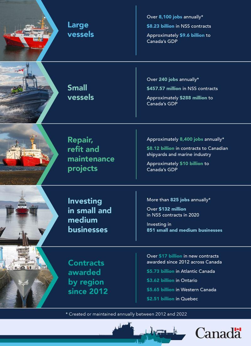 Rząd Kanady podkreśla, że zgodnie z tymi politykami stocznie i ich główni dostawcy podejmują działalność gospodarczą w Kanadzie równą wartości kontraktu i zapewniają ważne inwestycje w wybrane obszary, takie jak: