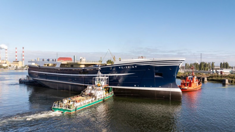 Nowy trawler zjechał z pochylni wzdłużnej B3 rufą do wody, po czym jednostka została przechwycony przez holowniki i odholowana do nabrzeża, gdzie prace stoczniowe będą kontynuowane.