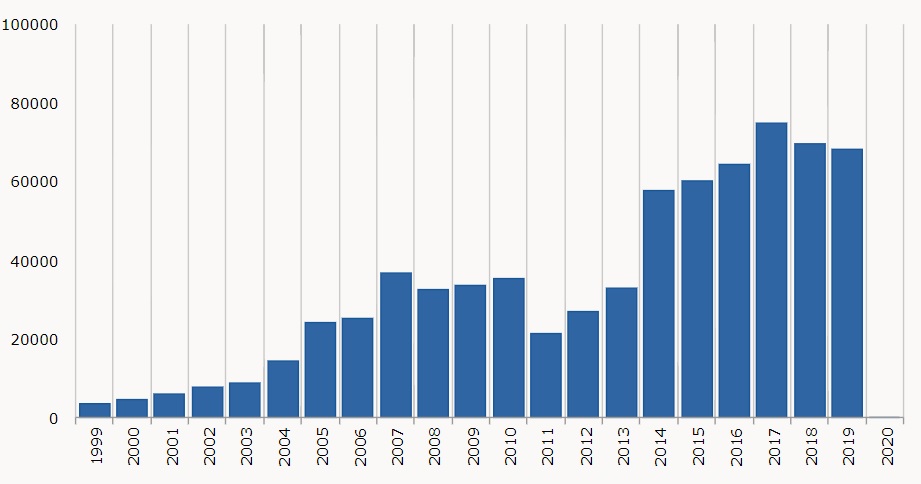 Roczna ilość obsługiwanych statków pasażerskich (wycieczkowców) w latach 1999 – 2020.