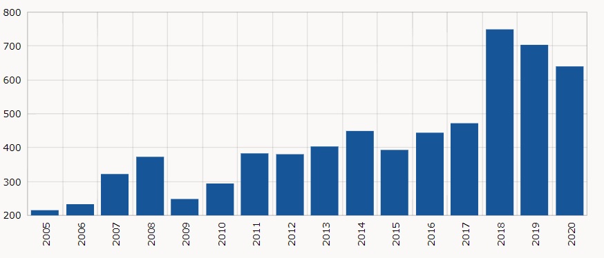 Roczna łączna ilość zwinięć statków latach 2005 – 2020.