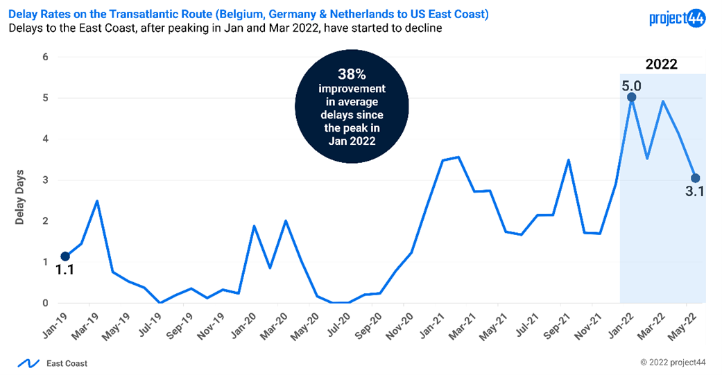 Jak wskazują dane project44, nie wydaje się, aby strajk w porcie Antwerpia-Brugia miał znaczący wpływ na wolumen statków i czasy postoju. Jednak opóźnienia przesyłek z Europy do USA, choć zmniejszyły się o około 38% z najwyższych wartości odnotowanych w styczniu (5 dni) do 3,1 dnia w maju, to nadal są niezwykle wysokie jak na ten sezon.