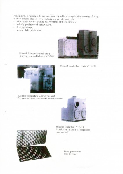 Podstawowa produkcja firmy to zamówienia dla przemysłu stoczniowego, którą w dużej mierze stanowi wyposażenie siłowni okrętowych: