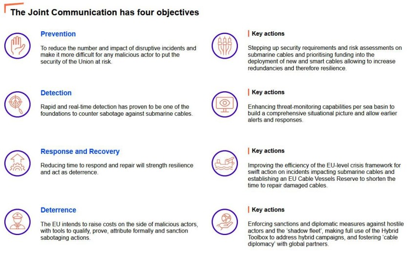 Komisja Europejska przekaże prawie miliard euro ze swojego budżetu na wzmocnienie nadzoru nad kablami podmorskimi i utworzenie floty statków do napraw awaryjnych, poinformowała w 21 lutego br. wiceprzewodnicząca wykonawcza Komisji. Środki zostaną również wykorzystane na specjalne drony i części zamienne do uszkodzonych kabli. Komisja Europejska swoje działanie uzasadnia tym, że „rządy europejskie są zaniepokojone serią ostatnich incydentów, w których kable energetyczne, łącza telekomunikacyjne i gazociągi zostały uszkodzone, prawdopodobnie celowo”.