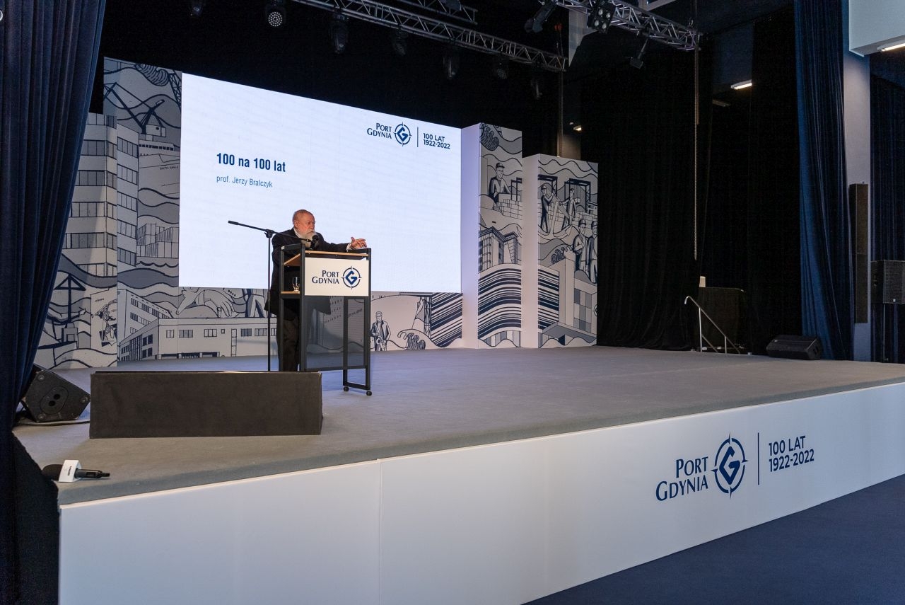 Po powitaniu gości przez prezesa Zarządu Morskiego Portu Gdynia Jacka Sadaja na mównicy pojawił się jednak gość specjalny – znany językoznawca, prof. Jerzy Bralczyk, który opowiedział o słowach „port” i „sto” od strony językowej.