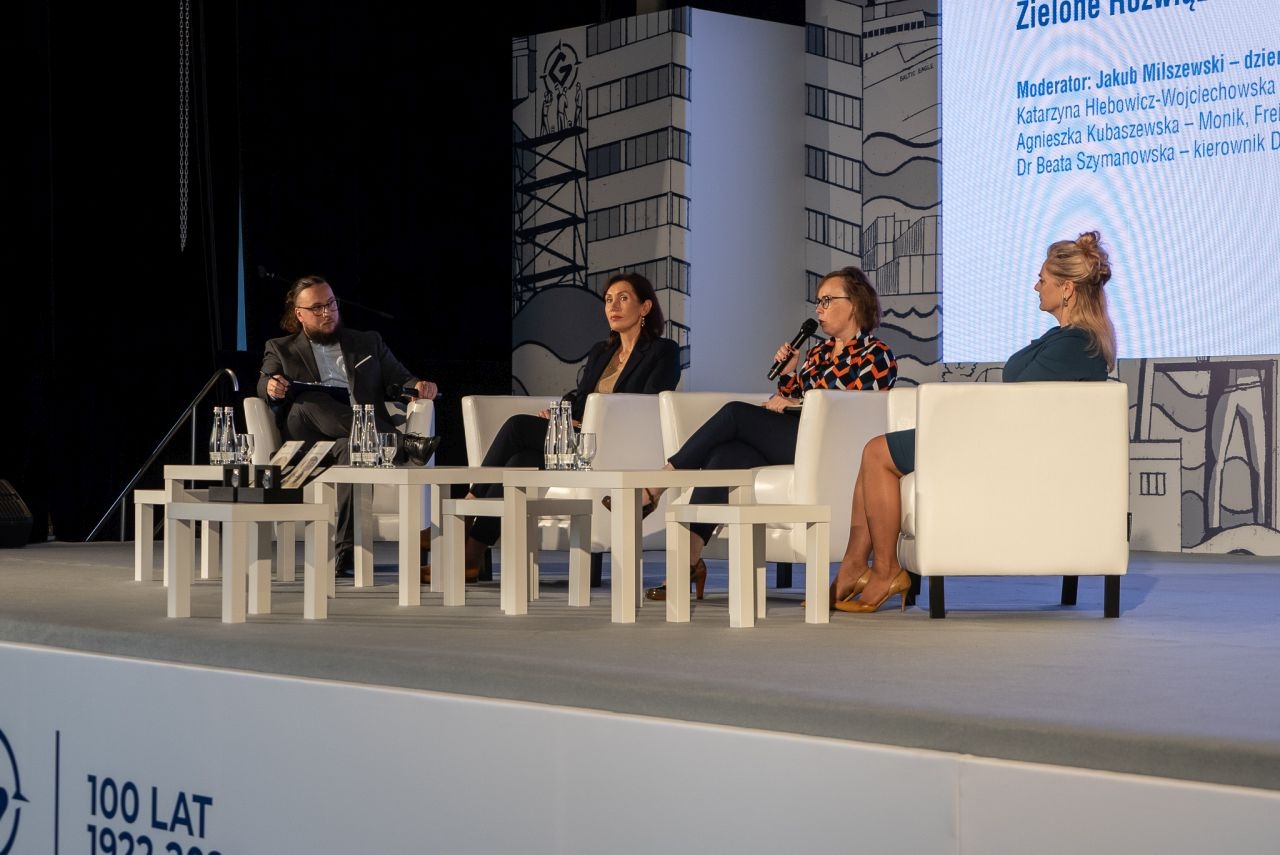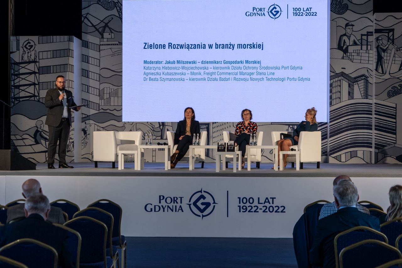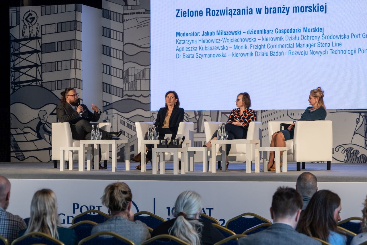 Ostatnim panel dyskusyjny pierwszego dnia poświęcony był zielonym rozwiązaniom w branży morskiej. Moderatorem dyskusji był Jakub Milszewski z portalu GospodarkaMorska.pl, a grono ekspertek stanowiły Katarzyna Hlebowicz-Wojciechowska – kierownik Działu Ochrony Środowiska w Porcie Gdynia, dr Beata Szymanowska – kierownik Działu Badań i Rozwoju Nowych Technologii Portu Gdynia oraz Agnieszka Kubaszewska-Monik, Freight Commercial Manager w Stena Line. Prowadzący zaznaczył na wstępie, że ogólnie pojęte tematy „zielone” stanowią bardzo pojemną kategorię, toteż w dyskusji uczestnicy skupili się na działaniach realizowanych w Porcie Gdynia oraz wdrażanych przez Stena Line. Agnieszka Kubaszewska-Monik reprezentująca przewoźnika zwróciła uwagę, że koniec końców ważne jest także otoczenie komercyjne takich realizacji – choć są one niezbędne, należy zwiększać świadomość klientów, zarówno korporacyjnych, jak i prywatnych, bo to oni będą pokrywać przynajmniej część kosztów tych projektów, choć jednocześnie to bardzo często oni także ich wymagają. Opowiedziała także o prowadzonych w Stena Line testach jednego z alternatywnych paliw – metanolu, prowadzonych za pomocą przebudowanego promu Stena Germanica.