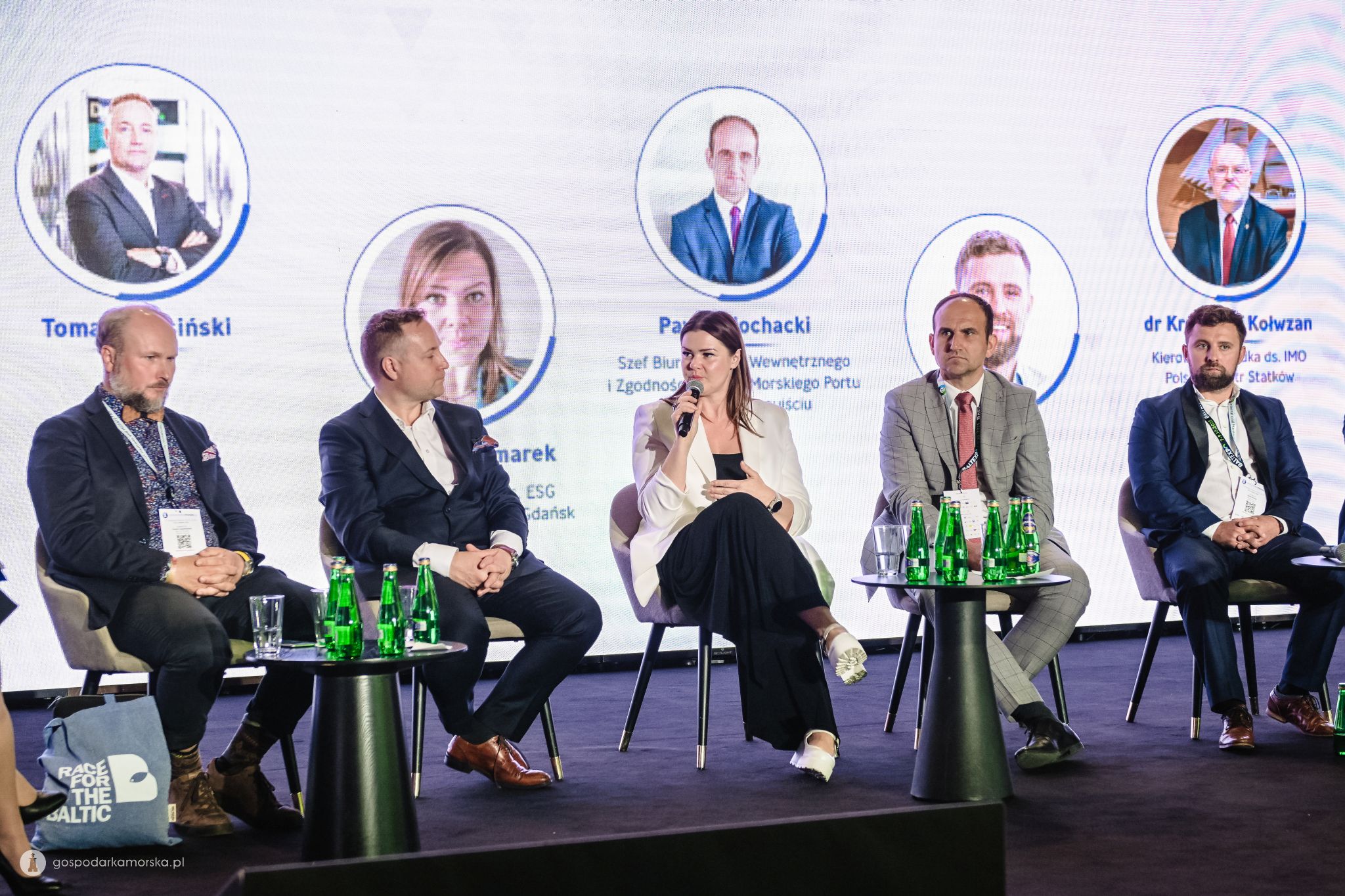 Następnie na scenie pojawili się pozostali prelegenci: Kamil Jagodziński - Business Manager, Race For The Baltic, Tomasz Gasiński - Deloitte, Barbara Kaczmarek - Główny Specjalista ds. ESG, Zarząd Morskiego Portu Gdańsk, Paweł Płochacki - Szef Biura Audytu Wewnętrznego i Zgodności, Zarząd Morskiego Portu Szczecin i Świnoujściu, Rafał Wolak - Prezes Zarządu, SeaData oraz dr Krzysztof Kołwzan - kierownik Ośrodka ds. IMO, Polski Rejestr Statków wraz z moderatorką dyskusji - dr Joanną Czerepko.