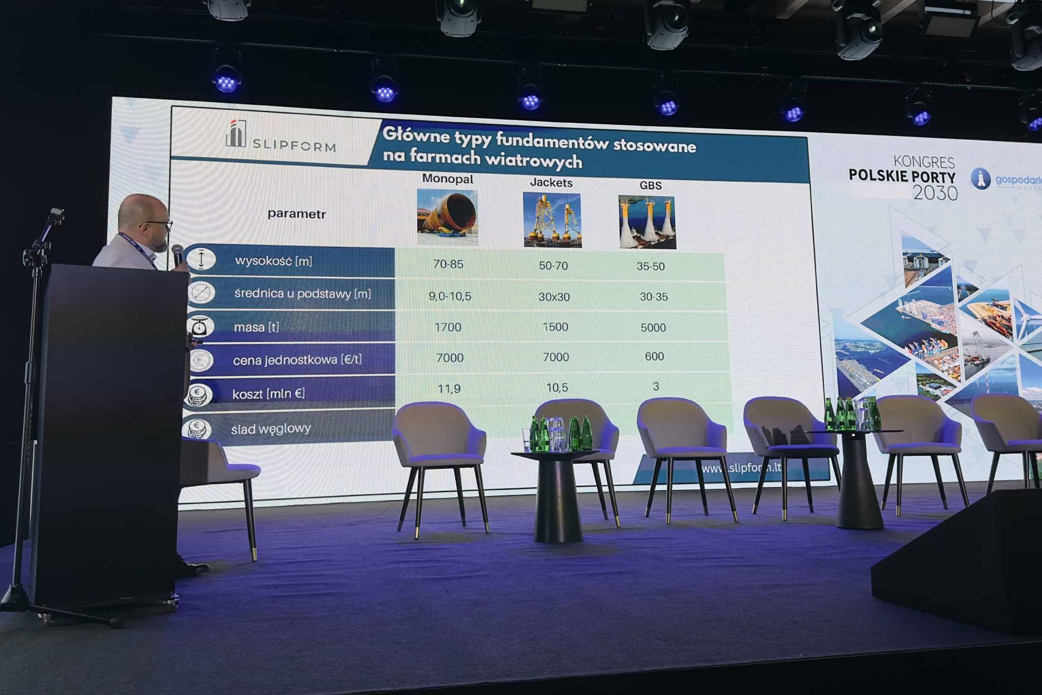 Daniel Kisała - Prezes Zarządu SLIPFORM opowiedział o fundamentach grawitacyjnych, które mogą stać się szansą na rozwój portów morskich. Podczas prezentacji opisał on również nowoczesne technologie wykorzystywane przy budowie wież wiatrowych.