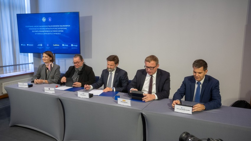 Na początku października podpisaliśmy razem z dyrektor Urzędu Morskiego w Gdyni Anną Stelmaszyk-Świerczyńską umowę na wybudowanie łącznie 2,5 km nowych falochronów osłonowych w Porcie Gdynia, które są warunkiem prowadzenia dalszych prac dotyczących Portu Zewnętrznego. Wykonawcą jest konsorcjum firm Budimex S.A., Roverpol Sp. z o.o. i Rover Maritime S.L. Wartość tego projektu sięga kwoty ponad 539 mln zł brutto i już w drugiej połowie 2028 roku planowane jest jego zakończenie. Do konstrukcji falochronów zostaną wykorzystane zatapiane skrzynie żelbetowe o długości ok. 50 m, szerokości 13,6 m i wysokości 14,5-16,5 m. Z kolei kształt i wielkość falochronów są skorelowane z fazowaniem pirsu Portu Zewnętrznego. Co jednak warte podkreślenia, takie rozwiązanie było uwzględnione już na etapie decyzji administracyjnych wydanych na rzecz inwestycji. Falochrony budujemy w ścisłej współpracy z Urzędem Morskim w Gdyni, Port Gdynia pełni rolę inwestora zastępczego, a środki na realizację tej inwestycji są zabezpieczone.