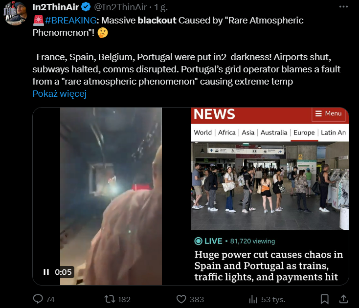W Hiszpanii panika po blackout ludzie wykupują wszystko ze sklepu oczywiście tylko Ci co mają gotówkę. pic.twitter.com/cOe4Pb4z3l