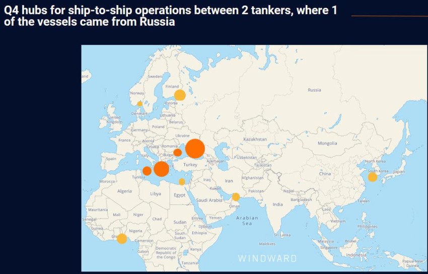 W pobliżu Krety nie było takich operacji, w pobliżu Malty i Ceuty spadły odpowiednio 70% oraz o 50%. Natomiast na wodach wokół Malakki i wybrzeży Zatoki Perskiej odnotowano wzrosty odpowiednio o 118% i 100% w porównaniu do trzeciego kwartału ub.r. Po tym jak w III kwartale Senegal zanotował spadek przeładunków STS o 70%, w IV kwartale statki z Rosji tu powróciły i nastąpił wzrost STS o 150%.