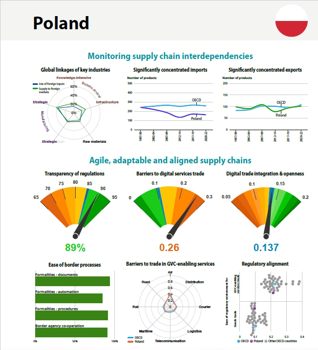 Aby wesprzeć decydentów, Raport OECD dokonał charakterystyki każdego kraju członkowskiego OECD pod względem monitorowania stopnia współzależności krajów z partnerami handlowymi i warunków politycznych pozwalających na wprowadzenie elastycznych i dostosowanych do potrzeb gospodarki łańcuchów dostaw.