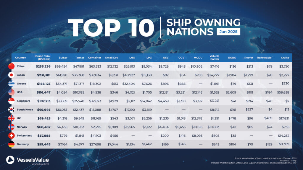 Chiny utrzymują pozycję lidera pod względem liczby statków i na początku 2025 r., objęły również prowadzenie pod względem wartości floty. Flota operatorów chińskich oszacowana została przez VesselsValue na 255 mld USD. Zadecydował o tym fakt, że Chiny posiadają liczną flotę masowców i kontenerowców o wartości odpowiednio 68,4 mld USD i 63,5 mld USD.