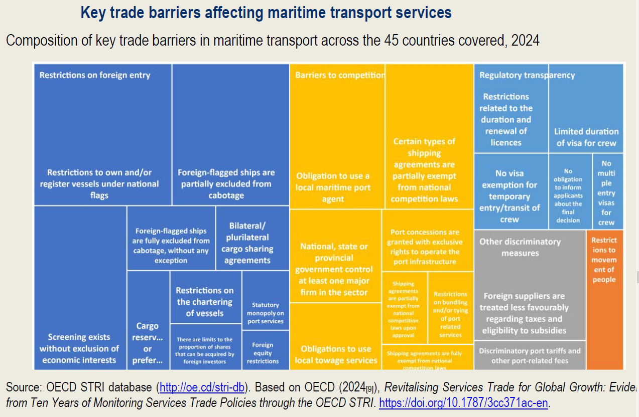 W oparciu o dane OECD Services Trade Restrictiveness Index (STRI) zidentyfikować szereg kluczowych wyzwań, które wpływają na międzynarodowy handel usługami transportu morskiego. Jednym z podstawowych jest ograniczony dostęp do niektórych segmentów rynku i operacji kabotażowych.