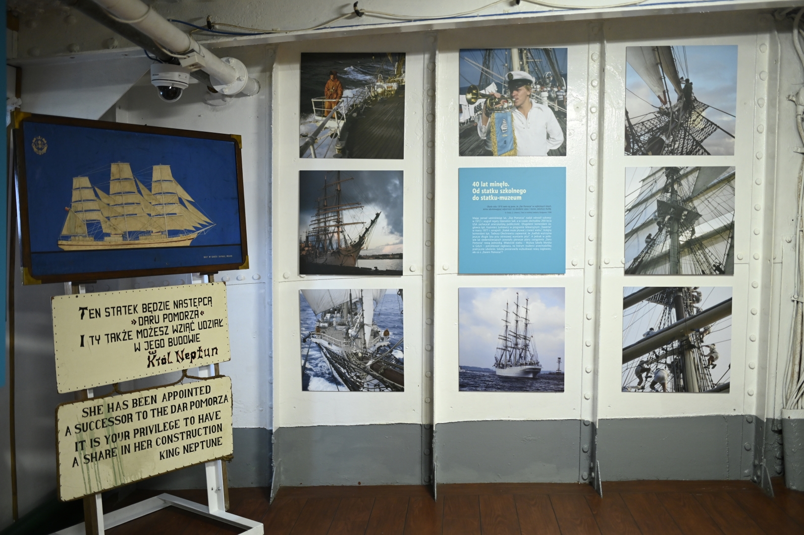 Wystawa czasowa 40 lat minęło. Od statku szkolnego do statku muzeum, prezentowana na żaglowcu, przypomina wydarzenia i osoby, dzięki którym ta historyczna jednostka zyskała swoje drugie życie. To właśnie w tym roku, dokładnie 27 maja, minie 40 lat od dnia, w którym Dar Pomorza został uroczyście otwarty dla zwiedzających jako statek-muzeum.