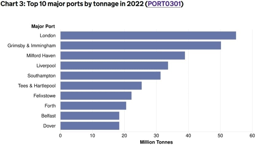W systemie ro-ro przewozi się około 100 mln t, ładunki suche to około 95 mln t, w systemie lo-lo przeładowuje się ponad 60 mln t, a ponad 15 mln t stanowi inna drobnica. W 2022 r. eksport zapewnił przeładunki w wysokości 111,6 mln ton. Przewozy kabotażowe ładunków między portami brytyjskimi w ruchu krajowym osiągnęły 94,4 mln t.