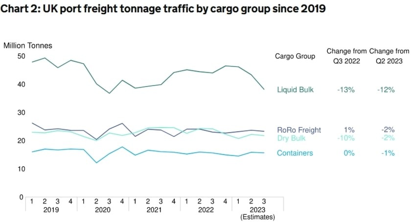 Porty brytyjskie kwartalnie przeładowują około 115 mln t towarów. Szlakami morskimi dociera do Wielkiej Brytanii dominująca część ładunków przeładowywanych w portach. W 2022 r. było to około 243,5 mln t. W 2023 r. podaż ładunków w portach brytyjskich zmalała w pierwszych 3 kwartałach o 4% do 434,2 mln t. Dominującym ładunkiem transportowanym z i do portów Wielkiej Brytanii są ładunki płynne (180 mln t w 2022 r.).