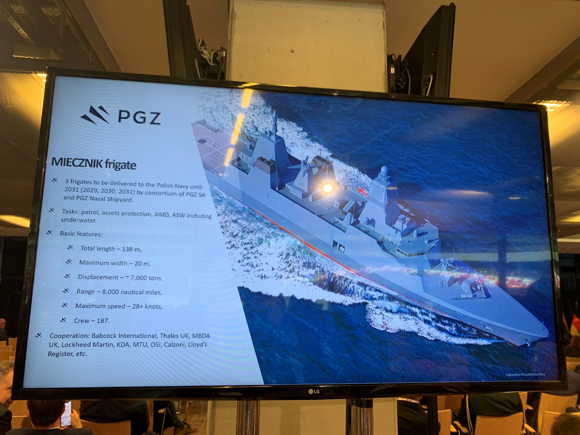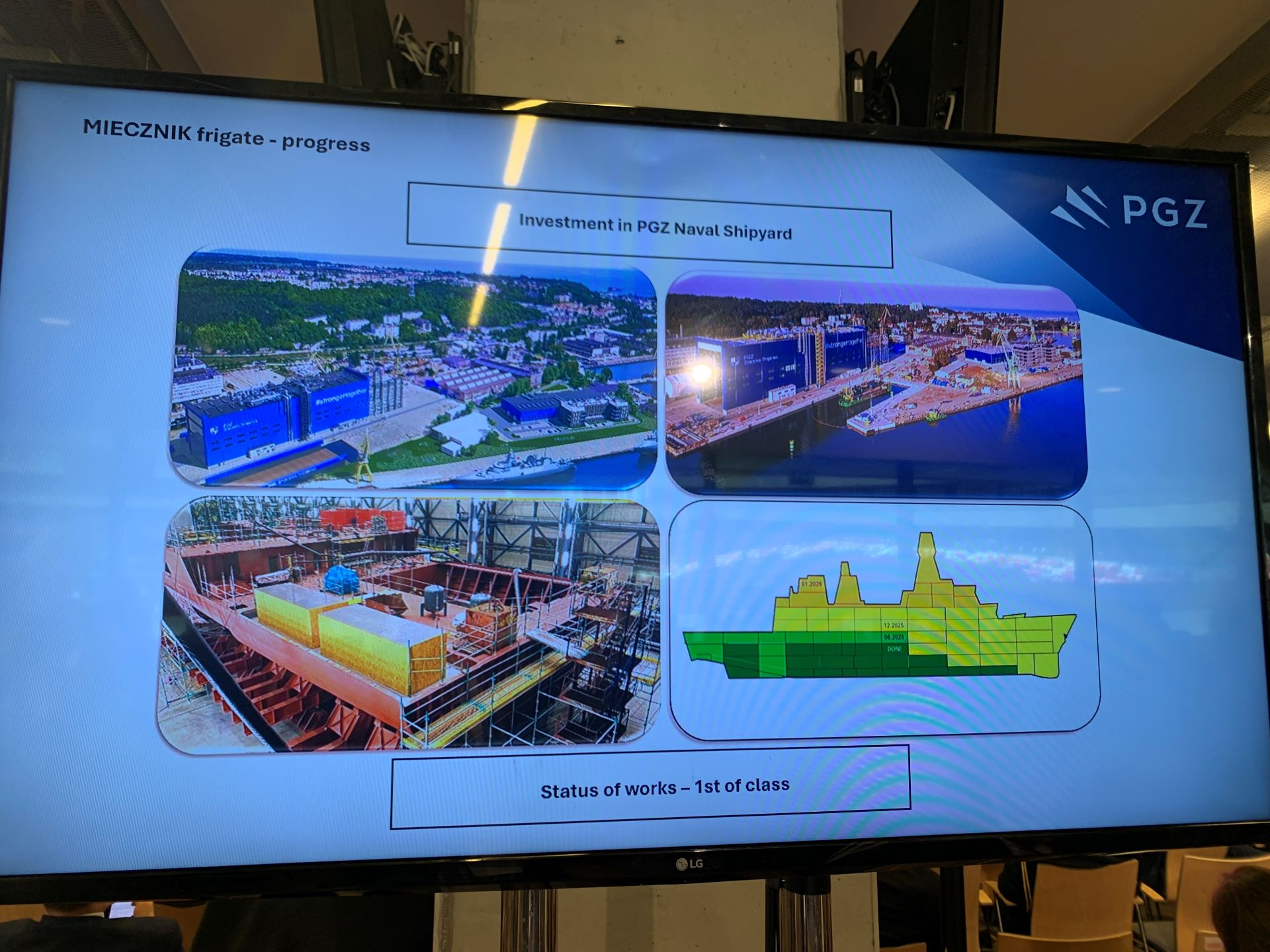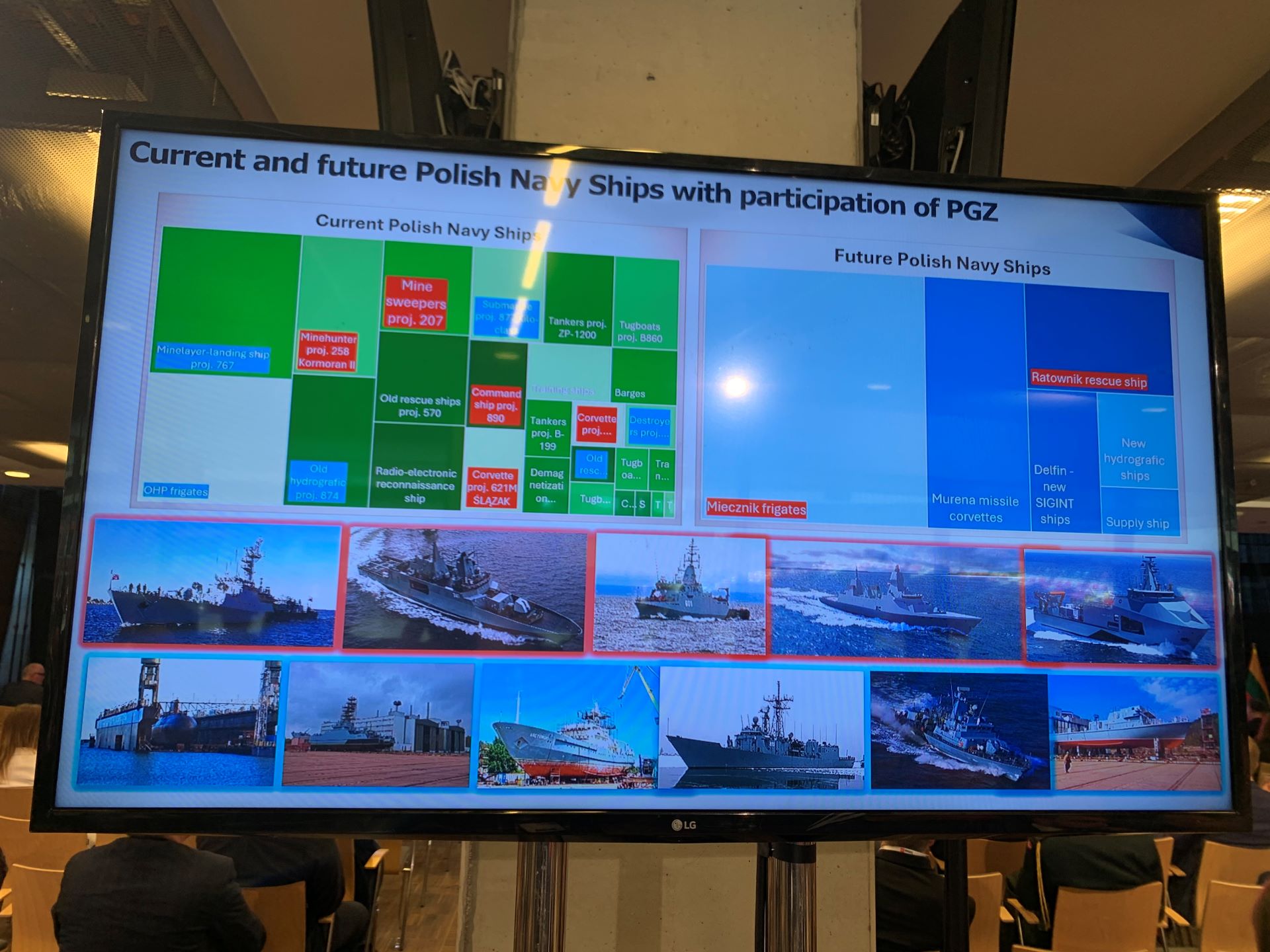 Co też wskazał prelegent, od kilku lat w grupie PGZ jest także Stocznia Remontowa Nauta, która także stale się rozwija. Choć pozostaje aktywna w sektorze cywilnym, w tym prowadzeniu remontów klasowych, tak realizuje też zlecenia związane z serwisem okrętów polskiej Marynarki Wojennej. W przyszłości zakres zleceń dla podmiotów wojskowych ma wzrastać. PGZ S.A. jest też mniejszościowym udziałowcem w stoczni CRIST S.A., która obok szeregu zleceń cywilnych także realizuje te dla sił zbrojnych. Obecnie powstaje tam przednia część kadłuba pierwszej fregaty programu „Miecznik”, której wodowanie zapowiedziano na 2026 roku. Co też należy zauważyć, wszystkie te zakłady mieszczą się w Gdyni.