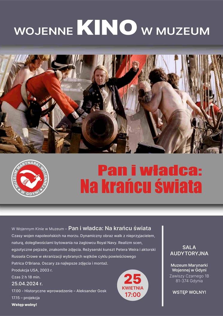 Muzeum Marynarki Wojennej w Gdyni zaprasza na kolejny seans z cyklu Kino Wojenne w Muzeum. Wyświetlanym filmem będzie tym razem „Pan i władca: Na krańcu świata”.