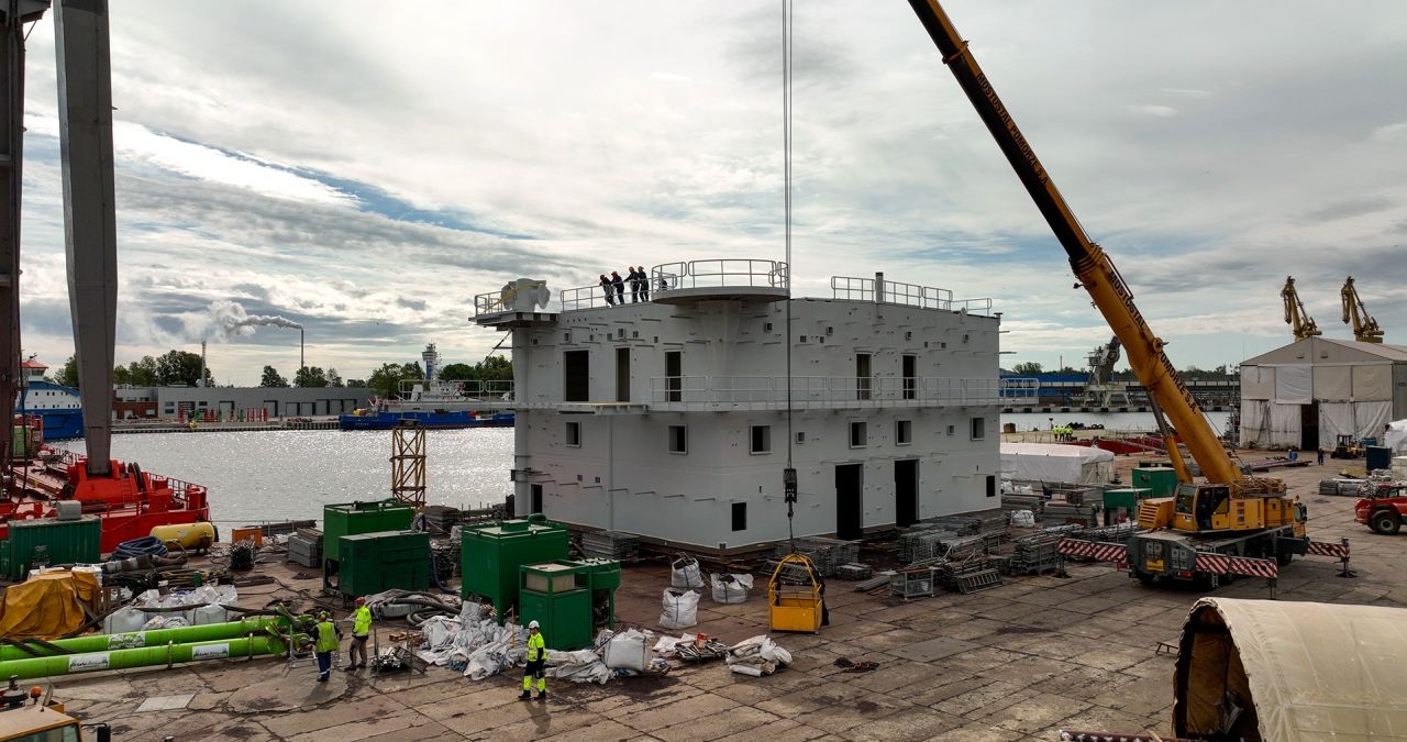 Po podniesieniu trafostacji, dźwig podpłynął do barki i ulokował ją we właściwym miejscu. Umocowana na barce konstrukcja trafostacji powstawała w Mostostalu Pomorze od czwartego kwartału 2021 roku.