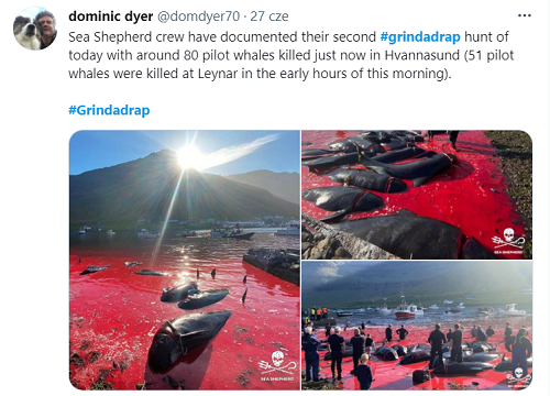 Myśliwi na Wyspach Owczych, terytorium zależnym Dani, zabili 175 grindwali, barwiąc krwią morze na czerwono. Wcześniej łodziami zapędzili zwierzęta w kierunku brzegu. Na płyciznach czekali na nie myśliwi z harpunami, hakami i nożami - podaje brytyjski portal Mail Online.