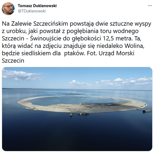 Na Zalewie Szczecińskim powstają dwie sztuczne wyspy z urobku wydobytego z dna podczas pogłębiania toru wodnego Świnoujście - Szczecin do 12,5m. Wyspy powstają na wysokości 22 i 28 km toru licząc od Świnoujścia.