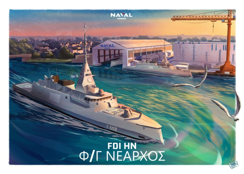 Fregata HS Nearchos (F-602) po wyprowadzeniu z hali kadłubowej na zatokę dołączyła na rzece Scorff do bliźniaczego HS Kimon, który został zwodowany 4 października ub. r. i aktualnie przechodzi próby portowe przed rozpoczęciem pierwszych prób morskich. Wydarzenie to ma potwierdzać zdolność francuskiego przemysłu stoczniowego, który przy silnym udziale greckich podmiotów buduje nowe okręty dla zamawiającego. W związku z tym zwodowana fregata, jak i inne jednostki FDI mają posiadać elementy wyposażenia „made in Greece”. Naval Group podkreśla tu długoterminową współpracę przemysłową między Francją a Grecją, która ma charakteryzować się w szczególności integracją wielu greckich producentów z łańcuchem dostaw firmy.