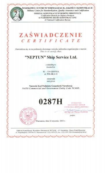 In 2003 our company was given NATO Commercial and Government Entity Code NCAGE: 0287H For many years, we have supplied the majority of Navy Ships, which enter Port of Gdynia, during the BALTOPS sea operations.