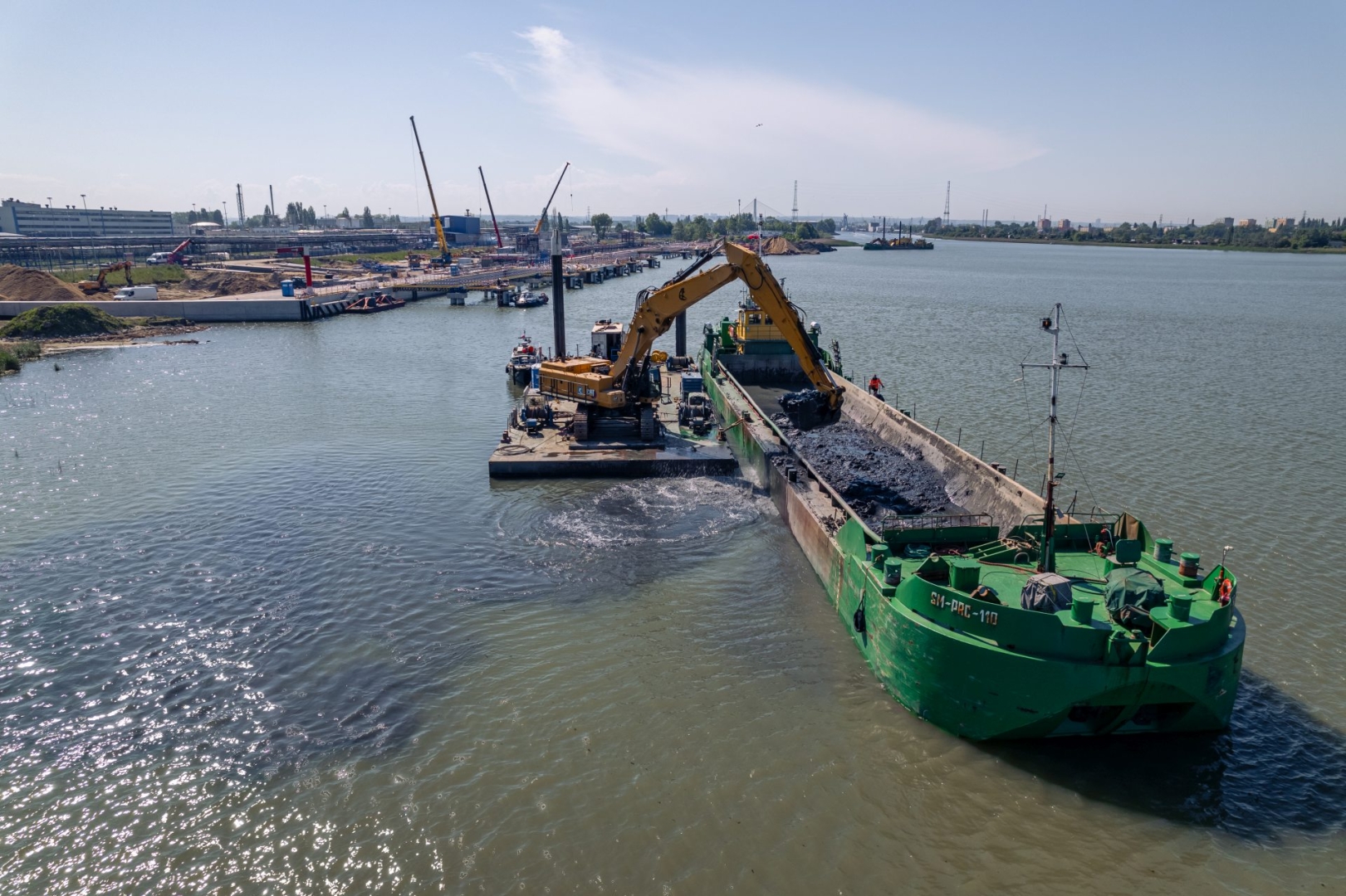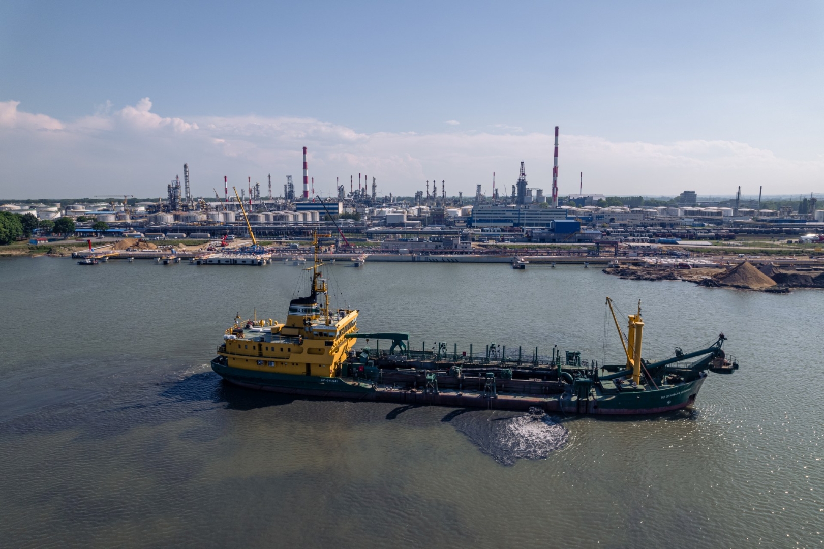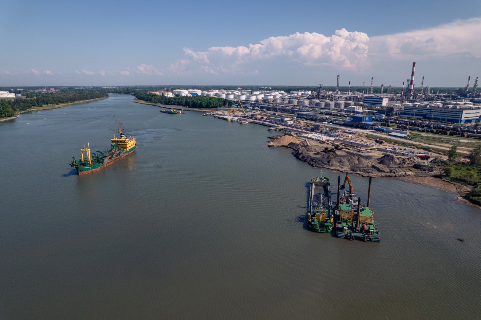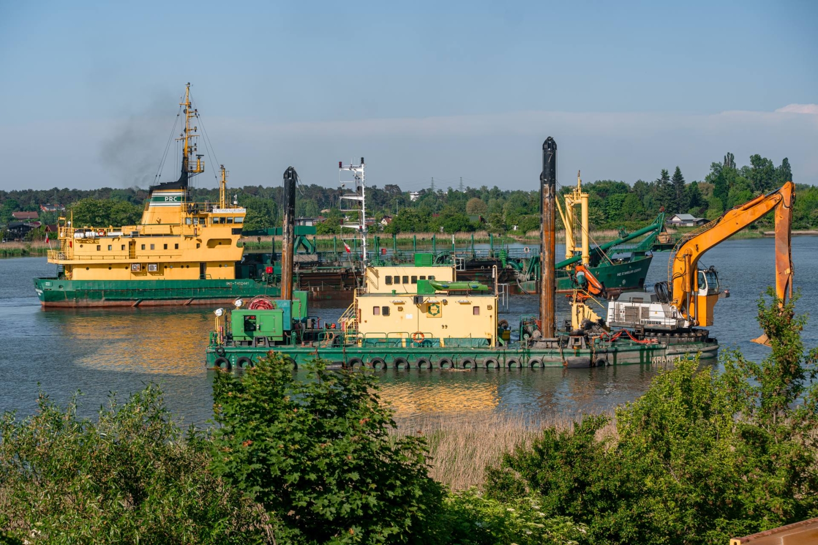 Trwa budowa Morskiego Terminala Przeładunkowego na Martwej Wiśle. Obecnie prowadzone są m.in. roboty podczyszczeniowe, do których wykorzystywane są wysokospecjalistyczne, nowoczesne maszyny, takie jak pogłębiarka Kraken czy koparka gąsiennicowa stojąca na pontonie Osiłku. Jednocześnie wykonywana jest konstrukcja stalowa i armatura technologiczna przyszłego terminala.