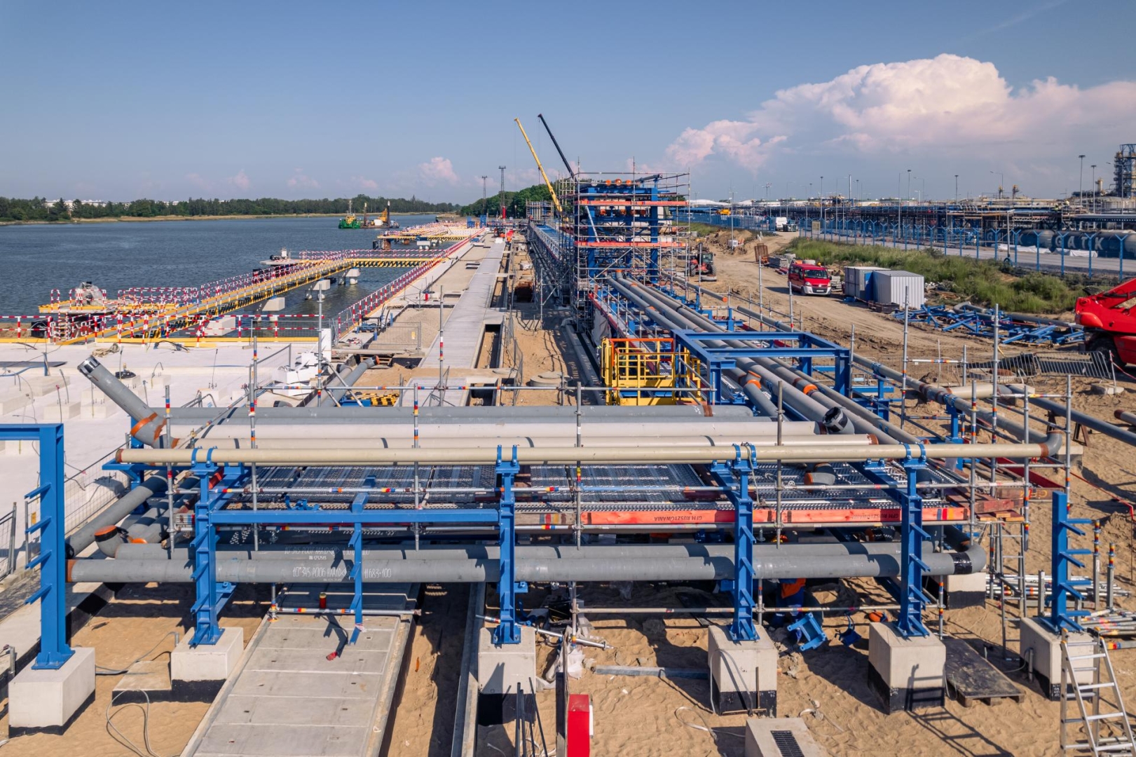 – Obecnie budowa wkroczyła w etap wykonywania konstrukcji stalowej i armatury technologicznej na terenie terminala. Dostarczane są sprefabrykowane elementy konstrukcji stalowej oraz rurociągów technologicznych, które poddawane są procesowi spawania. Dodatkowo trwają prace wykończeniowe Budynku Zaplecza Technicznego w skrócie BZT – mówi Maciej Klecha, kierownik budowy z Grupy NDI.