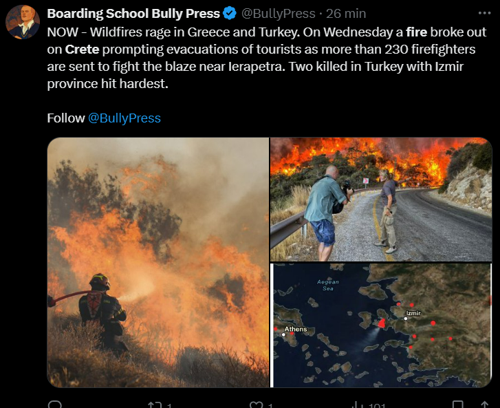 W środę po południu doszło do wybuchu pożaru na południowo-wschodnim wybrzeżu Krety, w wyniku którego lokalne władze podjęły decyzję o ewakuacji ok. 5 tys. turystów z hoteli z okolic Jerapetry (miejscowości Agia Fotia, Achlia, Galini, Ferma i Kutsunari). Z kolei w tureckiej prowincji Izmir (Odemis) w wyniku pożaru ewakuowano kilkadziesiąt osób. Gubernator prowincji Suleyman Elban podał, że z ogniem walczy ponad 1000 pojazdów i sześć tysięcy osób; do akcji zaangażowano też 30 śmigłowców.