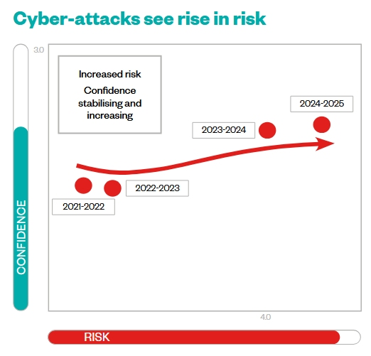 Cyberbezpieczeństwo jako główne ryzyko znajduje również odzwierciedlenie w Barometrze Ryzyka Allianz 2025, który umieścił cyberprzestępczość (cyberprzestępczość, sieci informatyczne, zakłócenia usług, złośliwe oprogramowanie/oprogramowanie wymuszające okup, naruszenia danych, grzywny i kary) jako główne ryzyko.