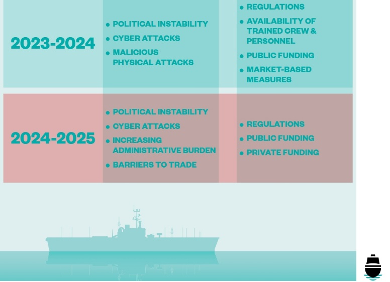 Liderzy działający na szlakach morskich „dostrzegają nowe wyzwania, i najwyraźniej czują się lepiej przygotowani do radzenia sobie z nimi”. W rankingu zagrożeń dla działalności operacyjnej flot utrzymują się ekstremalne zjawiska pogodowe, regulacje środowiskowe i niestabilności na rynkach regionalnych.