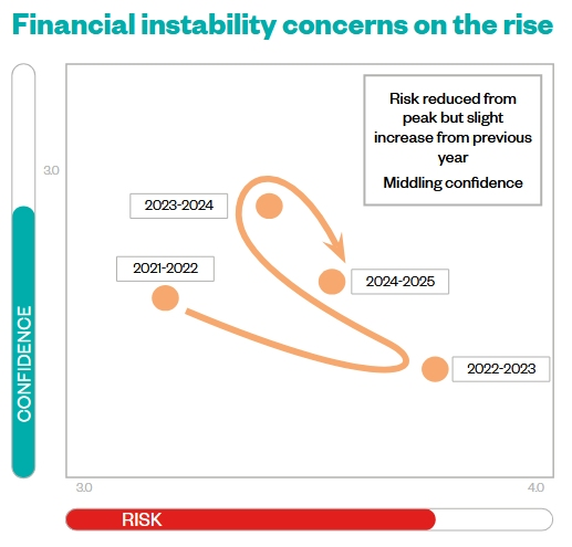 Niestabilność polityczna to jedno z największych ryzyk, zgłaszane przez mendżerów już trzeci rok z rzędu. Ryzyko to wyraźnie ewoluuje od bardzo niskiego ryzyka przy dużym zaufaniu do rządów z lat 2021-2022 do najwyższego ryzyka i najniższego zaufania stwierdzonego w „ICS Report 2024-2025”.