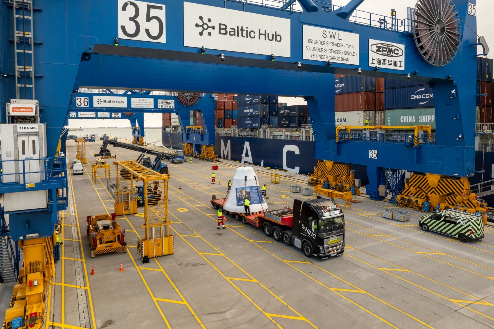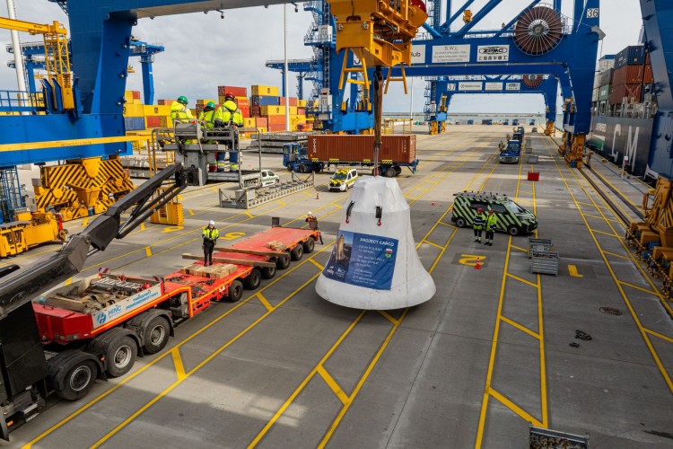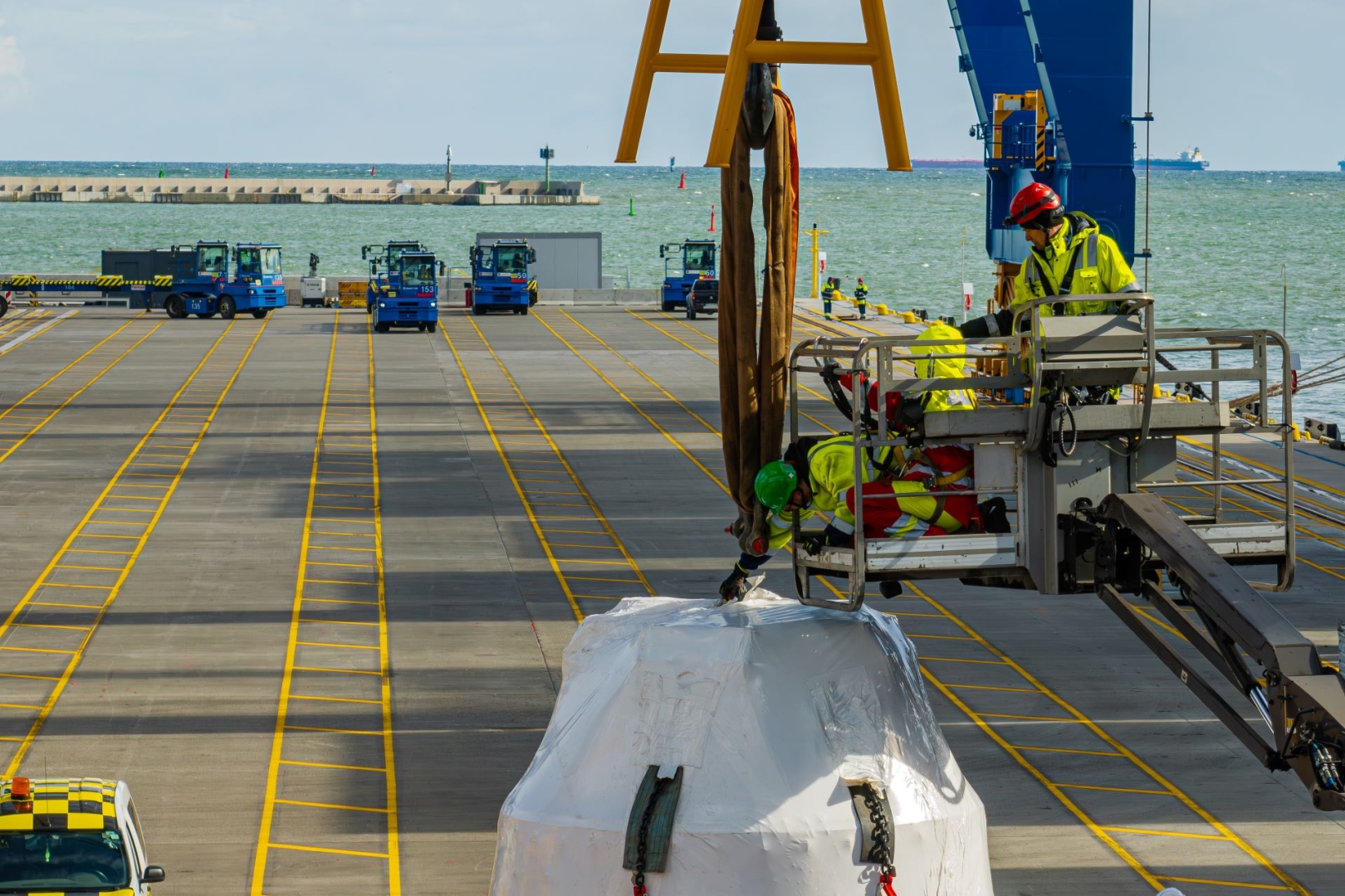 Na teren nabrzeża T3 dzwon przybył wprawdzie opakowany, niemniej było widać dokładnie jego sylwetkę. Do załadowania wykorzystano jedną z najnowszych suwnic STS, która umieściła obiekt na pokładzie statku, gdzie otrzymał swoje specjalne miejsce, otoczony z każdej strony kontenerami. Co istotne, znalazł się na kontenerowcu CMA CGM Mermaid, wyróżniającym się posiadanym napędem LNG i nadbudówką na dziobie, dzięki czemu poprawiono jego właściwości aerodynamiczne i ładowność. Po raz pierwszy do Portu Gdańsk wpłynął w kwietniu w 2024 roku.